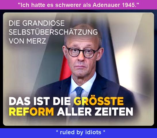 (Note: halten wir also fest: die CDU zerstörte nicht nur Deutschland, sie unterstützt mit hunderten Milliarden einen drogensüchtigen Clown des korruptesten Landes in der EU, anstatt die die eigene arme Bevölkerung, und hat damit das Land verraten, und die Zukunft verspielt.)