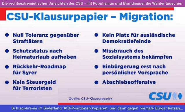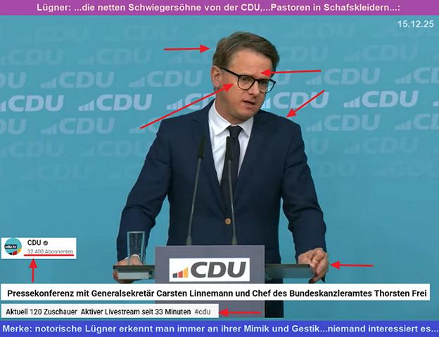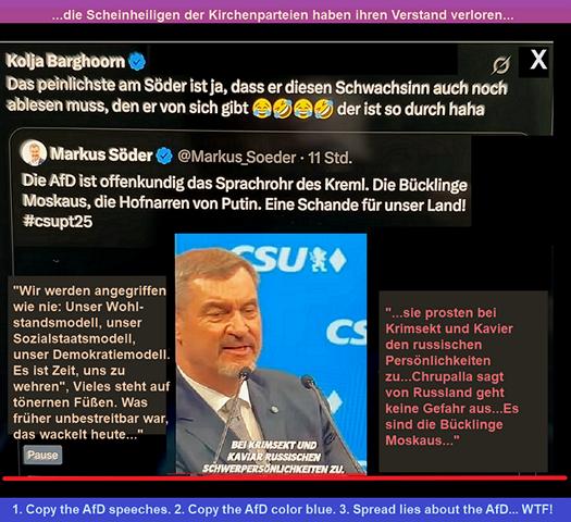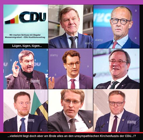 Und die CDU/CSU dreht weiter durch: sie wollen nun – nach dem eigenen kompletten Versagen – sämtliche staatskritische Äusserungen verbieten und die Konkurrenz ausschalten, in dem man die alternativen Medien einschränkt und die Wut der Bevölkerung versucht unter das Strafrecht zu stellen, damit man selbst „weiter an den Futtertrögen sitzen kann“, so O-Ton Markus Söder (er behauptet also: dass nur die CDU/CSU an den Futtertrögen – der Macht sässe und weiter zu sitzen hätte). okidoki.. Dazu bedient man sich der weisungsgebundenen Justiz und den Bürokraten in Brüssel, und einem eigenen linken Verfassungsschutz. Die CDU/CSU sieht sich somit durch ihre Verbindung mit der katholischen Kirche, als gottgegebene Herrschaftsklasse, welche auf Ewigkeit mit der Regierung betraut sei. Sie betrachten sich als die Elite Deutschlands, aufgrund eines höheren Bildungsgrades und mehr ererbten Vermögens, und blickt herablassend auf die arbeitende Bevölkerung herab, welche sie nur als Steuersklavenkaste ansieht, welche noch mehr und länger arbeiten könne, weil die CDU/CSU noch mehr Steuergelder verschwenden will. Die CDU/CSU wähnt sich in einer Feudalgesellschaft, mit den Bürgern als Bittsteller und einer Nomenklatura als neue Adelskaste. Die CDU/CSU und ihre Verbände und die Kirchen haben den Niedergang von Deutschlands zu verantworten, da nur ihre Parteimitglieder an allen Schalthebeln der Macht sitzen und sassen, seit 1945.