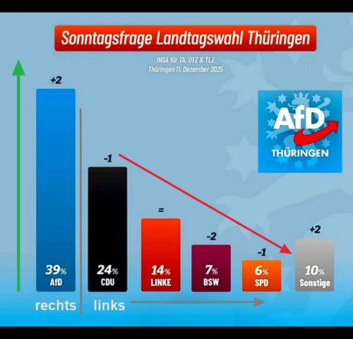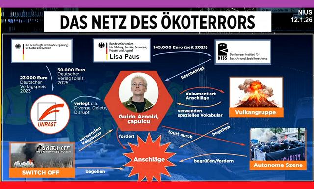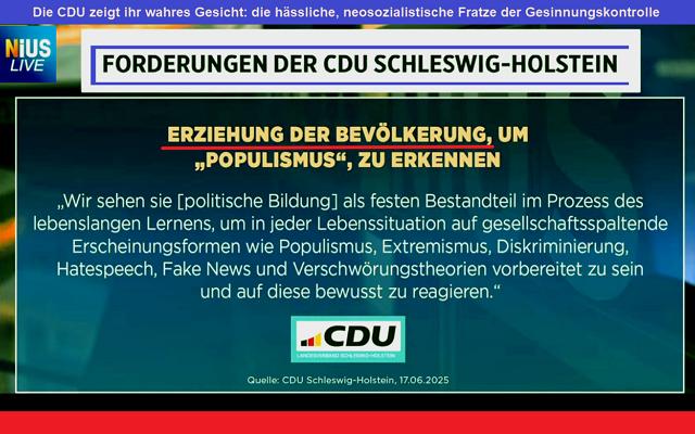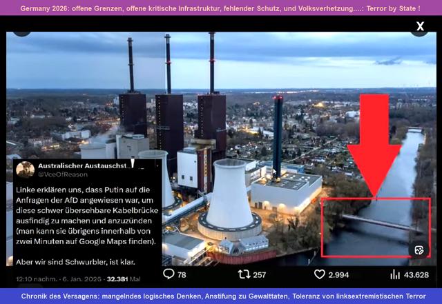 Zuerst war man zu dumm, die kritischen Punkte der Infrastruktur zu schützen, und alles zu veröffentlichen, dann hatte man nichts besseres zu tun, als junge verwirrte, linke Menschen in die Irre zu führen und gegen die eigene Bevölkerung aufzuhetzen (Straftat: Volksverhetzung), dann liess man Gewaltbereiten und Terroristen jahrelang in Ruhe gewähren, ganz so wie man es bereits schon beim importierten Islamismus erfolgreich getan hatte. Der Verfassungsschutz ist also entweder zu dumm, oder er steckt mit drinn. Dann redete man die Gefahren des Linksterrorismus klein, und hetzte die sich durch die Staatspropaganda – des Staats-TV mit seinen Agitatoren und Demagogen – bereits radikalisierten, psychisch beeinträchtigten Menschen in linkswoken Umfeldern der Staatsbediensteten, weiter auf (wie man an den Aktionen des Staates bei den Parteitagen der AfD sehen kann), und dann wartete man in aller Seelenruhe ab, wie die Saat aufging….um die Ereignisse und kommenden Events 2026 des politischen Versagens der einzig wahren Opposition anzuhängen, und die Verschwörungstheorie in die Welt zu setzen: dass an alledem Russland und Putin schuld seien. Dies ist in der Summe, wohl mit Sicherheit als Volksverrat einzustufen, und man hat dann noch die Frechheit dieses – bis dato 75 Jahre lang nicht benutzte Wort – auch noch der AfD anzuhängen, welche keinerlei Anteil an diesem Staatsversagen hat. So sagte der linksextreme Ministerpräsident Daniel Günther, CDU: ” alternative Medien wie Nius und solche Portale, werden von CDU-Mitgliedern gelesen und wietergeschickt: Wir müssen daher aufwachen, da dies unsere Gegner und Feinde der Demokratie sind, und wir müssen uns zusammenschliessen, bevor wir unsere Demokratie in 10 Jahren nicht mehr wiedererkennen werden.” – 7.1.25 ….Straftatbestand: Volksverhetzung erfüllt. Denn genau dies führt zu der Gewalt gegen die Opposition, und die freien alternativen Medien und linken Terror. Die CDU ist damit in letzter Konsequenz genauso Schuld am Linksterror wie die SPD, die Grünen und die Linken. Sie destabilisieren seit 2015 die Demokratie, die innere Sicherheit und die Medien als Kontrollinstanz der Politiker. – Aufwachen 2026!