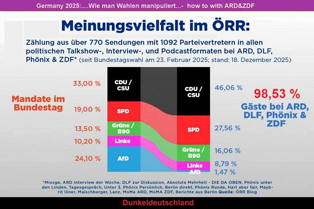 …vor den Bundeslandwahlen 2026, fährt der Staatsfunk nochmal alles an Propaganda auf und hat die alternativen Medien des rechtskonservativen Spektrums – neben der AfD – als seinen neuen Feind – neben Trum und Putin – markiert, als Nazis und Extremisten gebrandmarkt, den es nun zu unterdrücken gilt, abzuschalten, womögliche einzusperren,…wegen möglicher unbequemer Wahrheiten über das politisch-mediale System und das Parteienkarell.